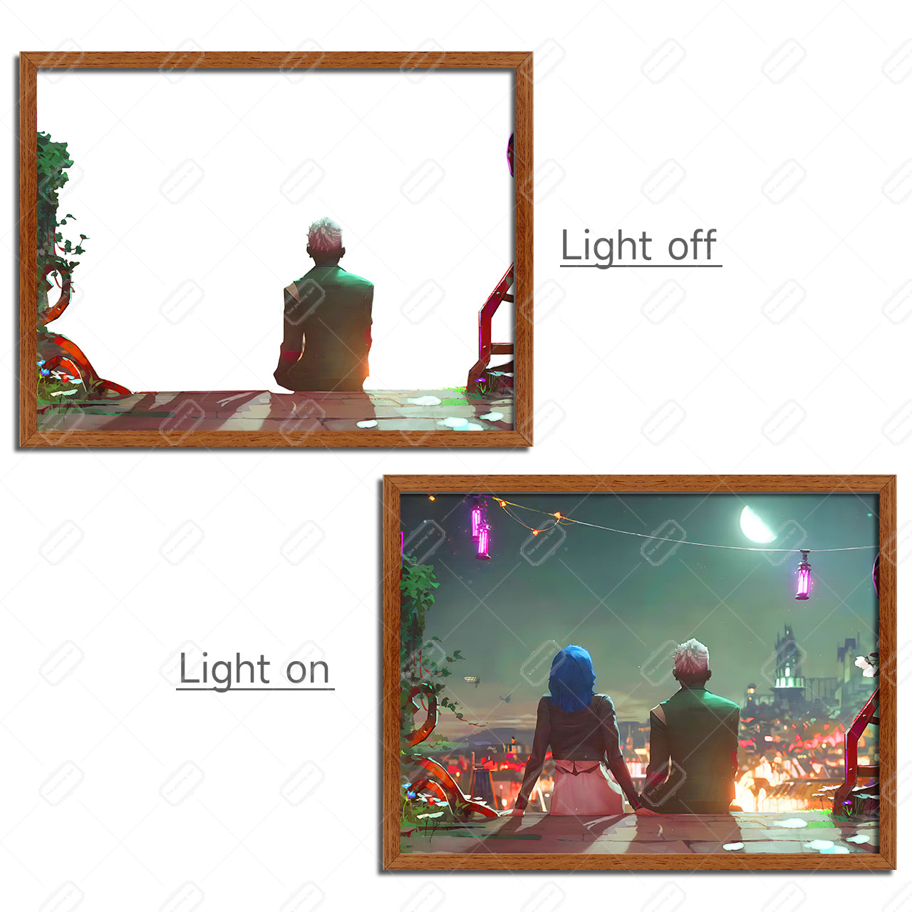 - Unique light-up effect: Black and white line art (lights off) and colored art (lights on)